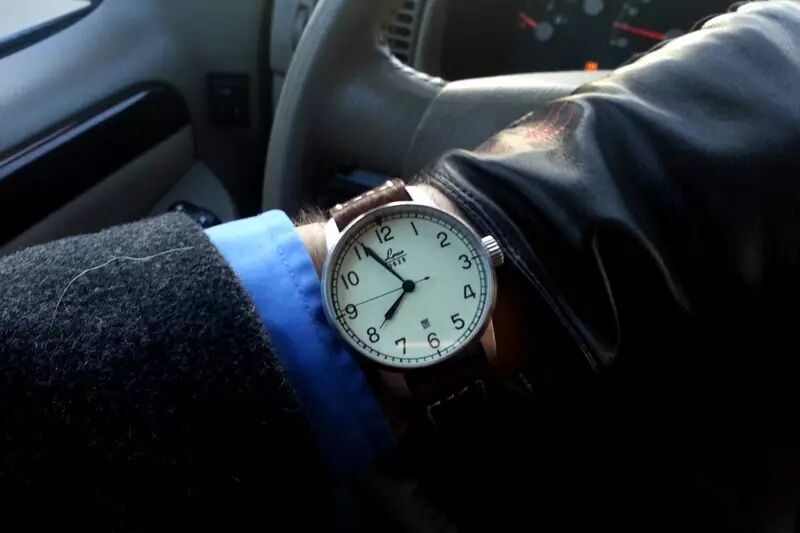为此,Laco 设计出了标有阿拉伯数字的内外环、不反光的表面,把时分秒三针涂上了醒目的荧光材料,表盘还带夜光功能,尽一切办法提高读认性。