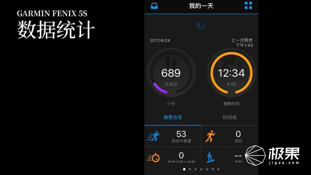 我们打开佳明的手机APP-Connent,首页是当日的活动统计总览。当日步数,睡眠时间,活动的卡路里和次数。右划是各项的详细统计和表格,细致的像个理科直男。一定能满足各种户外运动的发烧友。但作为轻度户外用户,可能这些统计缺乏一些数据可视化,过于的专业和繁琐。