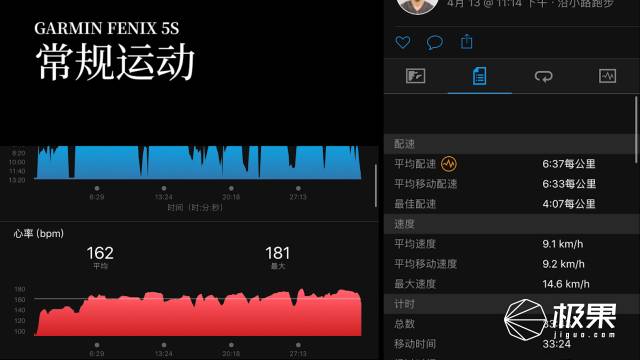 首先我们看两次五公里跑步的统计,测试时同时带着Fenix 5S与苹果表第二代。