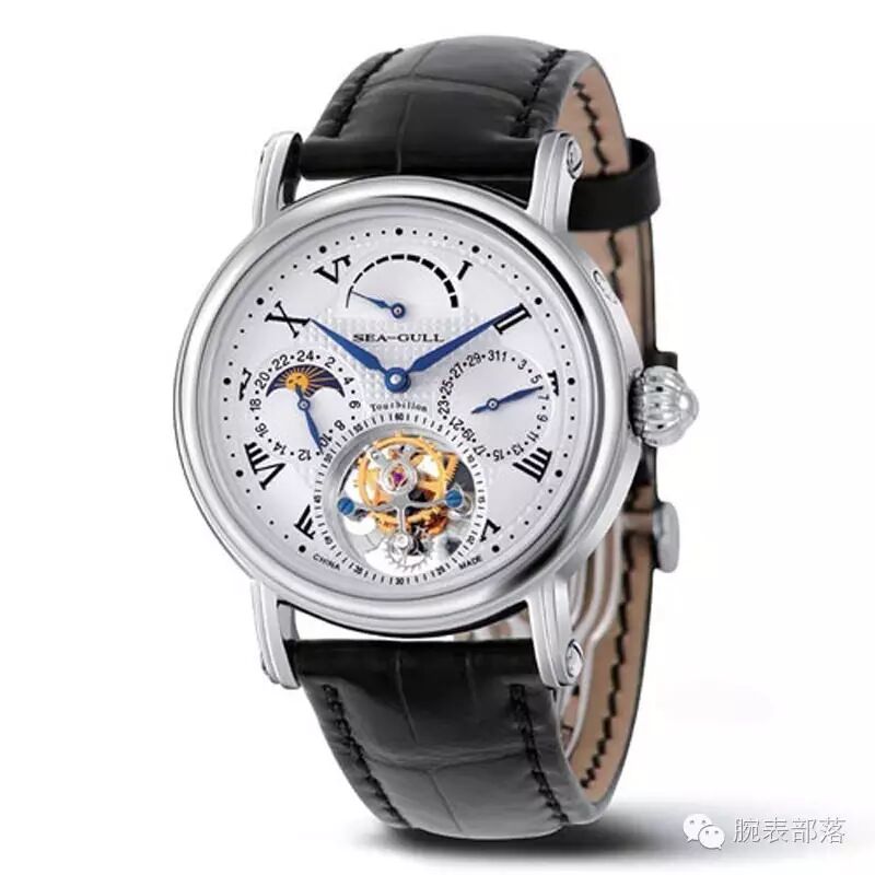 海鸥这枚陀飞轮腕表的型号为818.907,也是搭载自动机械机芯,不锈钢材质,具有日期显示、月相、动力储备显示、和陀飞轮等功能,鳄鱼皮表带,背透,表径39毫米,防水50米,参考价格50000元!(以实际价格为准)