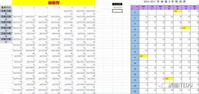 再来看右边真正的显示区域,本来是只要将单元格所对应的辅助列中相应“日”的数据填充进去就可以了,但是为了能把开学第一天和每个月的第一天能突出显示出来,需要单元格的公式中加上2个if()嵌套。