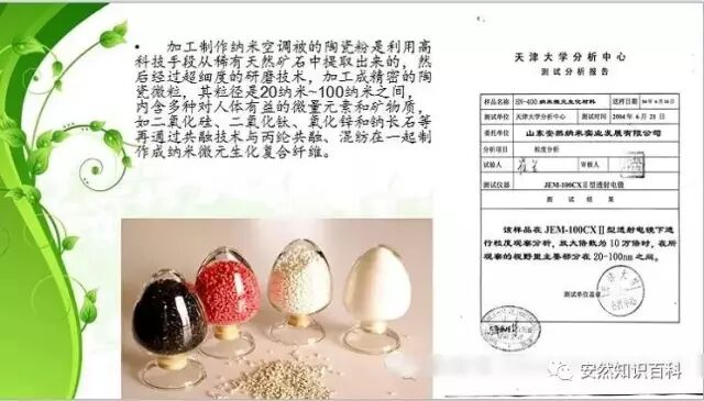 安然公司生产的纳米微元生化纺织品的原料是采集地球上对人体有益的天然矿石,运用高科技的超细研磨技术,加工成20-30纳米的超级微粒,与丙纶混融、喷丝合制成纳米级的长丝和短纤维。