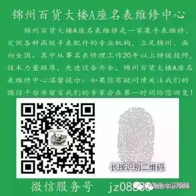 锦州百货大楼A座名表维修中心(中央大街店),是辽西最大的名表维修中心,专营名表精修,品牌特约维修,定制表带等业务,配备瑞士全套专业维护设备、工具,技师长期受专业技能培训,严格按照瑞士标准服务以下品牌 :