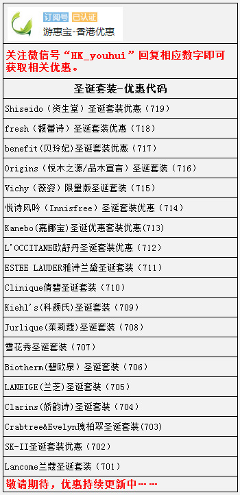 关注微信号:游惠宝、游惠宝-香港优惠、游惠宝-导购,回复代码“1”,即可获取主代码表,了解更多香港资讯。