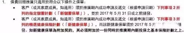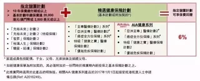 优惠内容:凡于推广期2017年1月1日至3月30日期间,所有客户或其家庭成员成功投保下列指定储蓄计划及精选健康保险计划,指定储蓄计划可享保费回赠优惠达6%。具体详情如下: