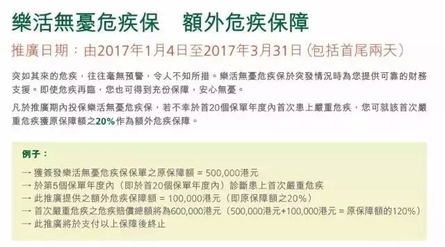 优惠内容:客戶凡于推广期2017年1月4日至2017年3月31日期间成功投保乐活无忧危疾保计划,若不幸于首20个保单年度内首次患上严重危疾,可就该首次严重危疾获得原保额之20%作为额外危疾保障。具体优惠信息如下: