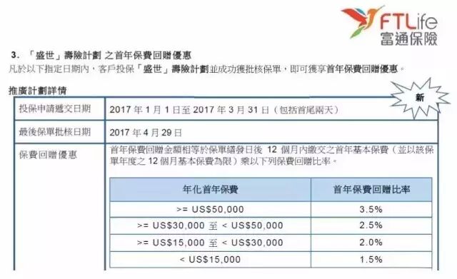 优惠内容:客戶凡于推广期2017年1月1日至2017年3月31日期间成功投保盛世寿险计划,最高可享首年保费回赠3.5%。具体优惠信息如下: