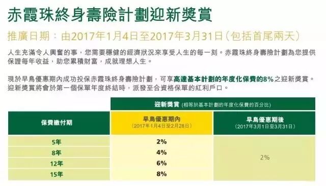 优惠内容:客戶凡于推广期2017年1月4日至2017年3月31日期间成功投保赤霞珠终身寿险计划,可享高达基本计划的年度化保费的8%迎新奖赏。迎新奖赏将会于第一个保单年度终结时,派发至合资格保单的红利户口。具体优惠信息如下: