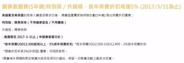优惠内容:客户即日起至2017年3月31日期间成功投保盈丰宝终身保险计划(5年缴)特别版,首年保费2500美元以上,可享2%首年保费折扣,首年保费12500美元以上,可享5%首年保费折扣,预缴还可再享年息3%(非保证)折扣优惠,具体优惠信息如下: