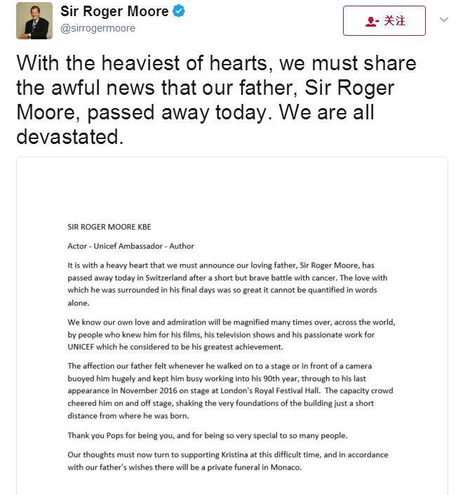 “我们带着沉重的心情告知大家,我们深爱的父亲,罗杰·摩尔爵士,在与癌症进行了短暂但英勇的搏斗后,在瑞士去世。”