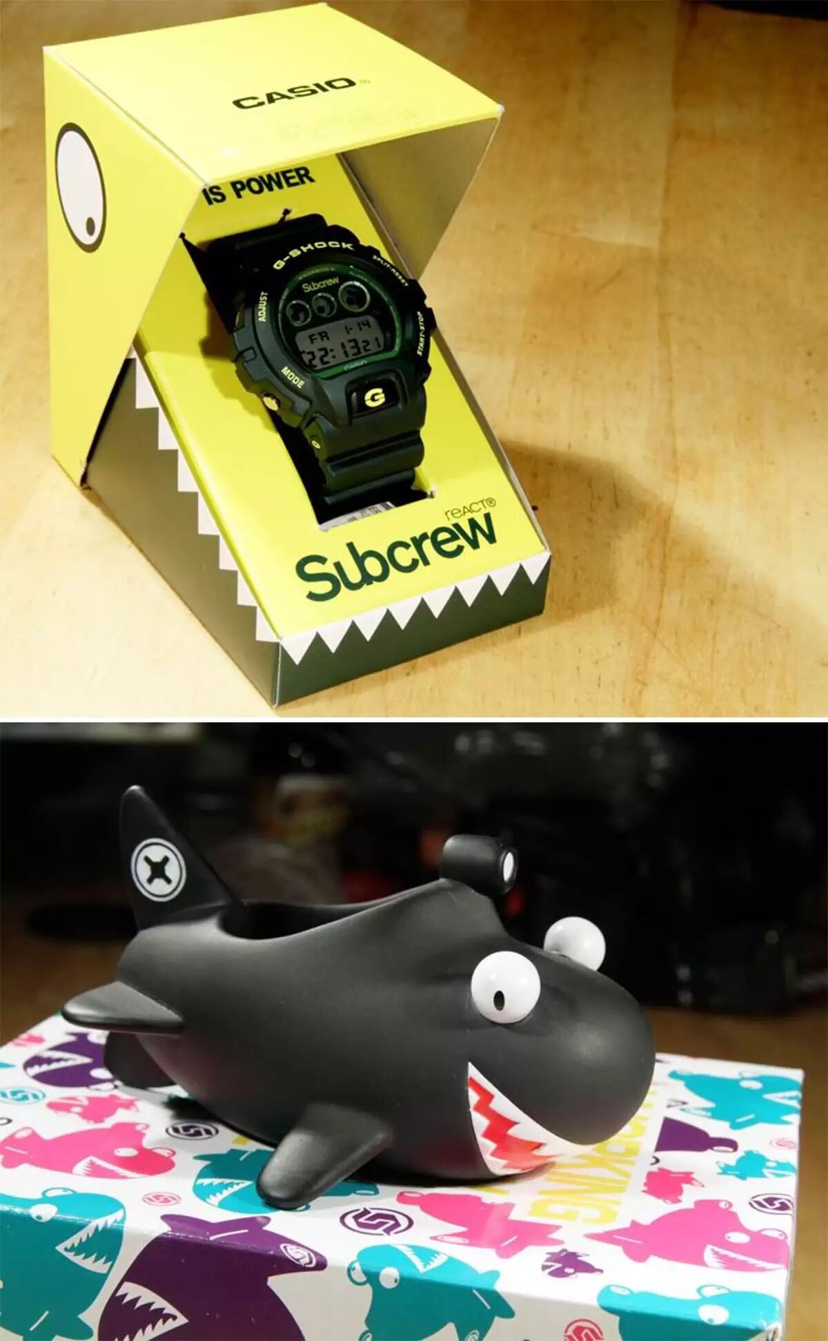 第一个,限量 100 个的 Subcrew “深水炸弹”套装。Subcrew 潜艇鲨鱼元素加持的 6900 和玩具鲨配套发售,作为当时网红 Sam 的迷弟,小 Ben 那时候可是为这个套装流了不少口水????