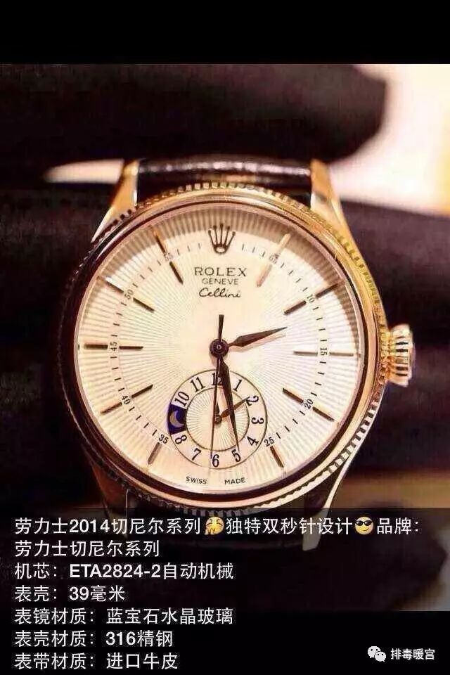 劳力士切尼尔系列独特双秒针设计品牌:劳力士切尼尔系列 机芯:ETA2824-2自动机械 表壳:39毫米 表镜材质:蓝宝石水晶玻璃 表壳材质:316精钢 表带材质:进口牛皮 背透:密底 防水深度:米