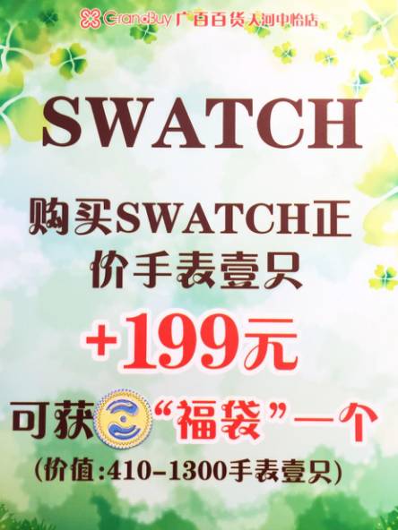 于广百天河中怡店swatch购买全场任意一款手表,加199元 即可获得“福袋”一个(福袋内含一只410元-1300元不等的手表)款式随机。