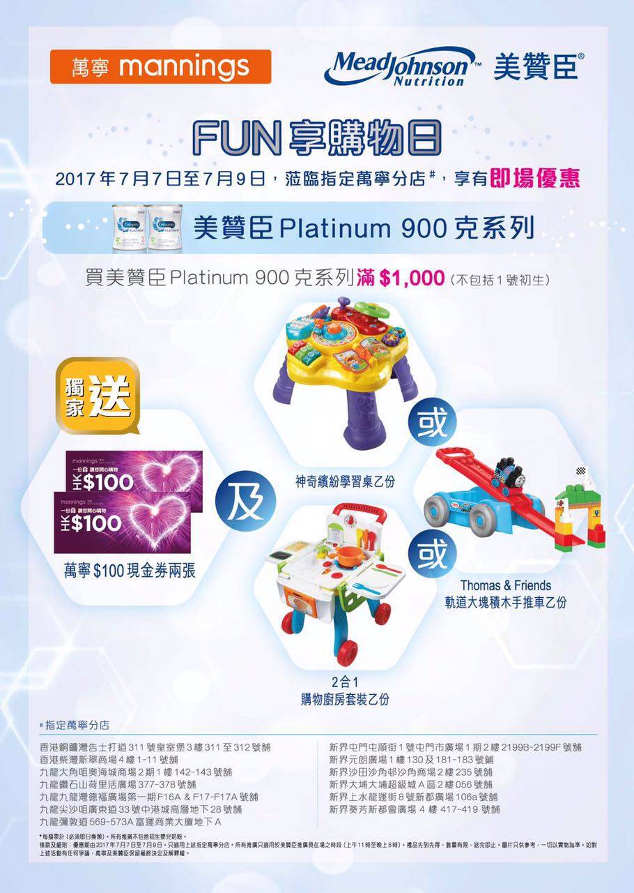 而且现在港版美赞臣联合万宁举办“fun享购物日”,优惠多多。从7月7日至7月9日,莅临指定万宁分店,即可享受以下优惠: