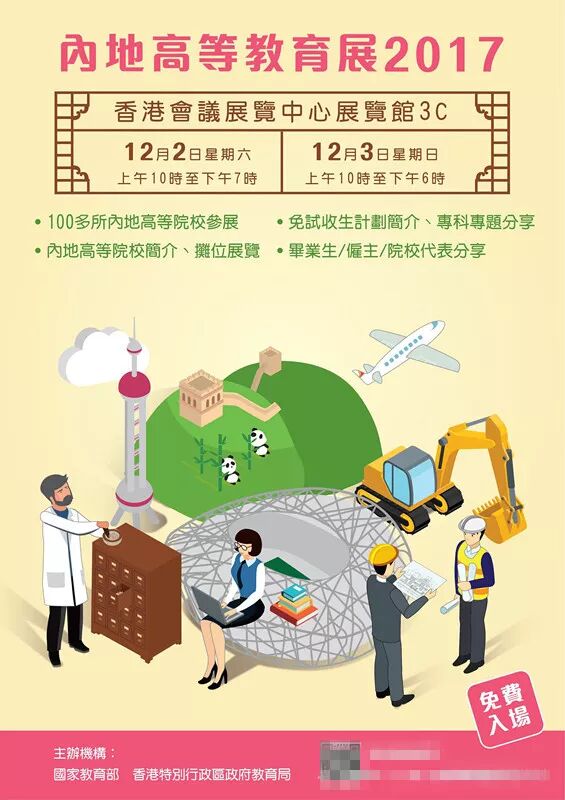 由国家教育部和香港特区政府教育局联合举办的“2017内地高等教育展”将于12月2至3日在湾仔香港会议展览中心举行,为有意赴内地升学的学生介绍“2018年内地部分高校免试招收香港学生计划”(免试收生计划)的安排和参与院校及其学科的资讯。