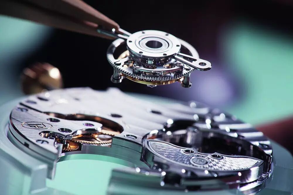 Tonda 1950 超薄飞行陀飞轮腕表拥有世界最薄的自动陀飞轮机芯 (3.4 毫米),和世界最轻的钛金属陀飞轮框架(0.255克)。叫作'飞行' 陀飞轮,是因为整个陀飞轮框架与板桥只有一个支撑连接点。用于自动上链的950铂金珍珠摆陀是成就机芯超薄特性的关键所在。珍珠摆陀是直接镶嵌于主夹板中的,因此不会额外增加机芯的厚度。大多数陀飞轮框架都是以精钢制成,因为这是一种加工方便的高强度金属。而钛金属虽然极轻但很难将其制成体积微小的陀飞轮框架。帕玛强尼克服了各种困难,用钛金属制造了全世界最轻的陀飞轮框架。由于其重量轻,在旋转的过程中不会损失扭矩。这样,陀飞轮的运行效率得以提升,腕表的计时精准度也就更加出色。由于陀飞轮每分钟旋转一圈,秒的显示就由陀飞轮框架上的一枚蓝钢指标负责。