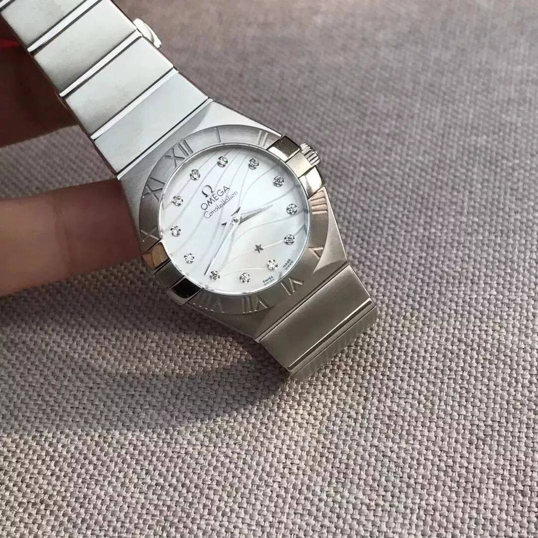 细节品鉴,全套包装!!白色珍珠贝母表盘,表盘是由12个钻石组成的小时刻度,27毫米精钢表壳配备镌刻罗马表壳的精钢表圈,圆形耐磨蓝宝石镜面,内部仿反光处理,原厂欧米茄1376机芯!!懂机芯的都知道这个货有多珍贵,速度下手!