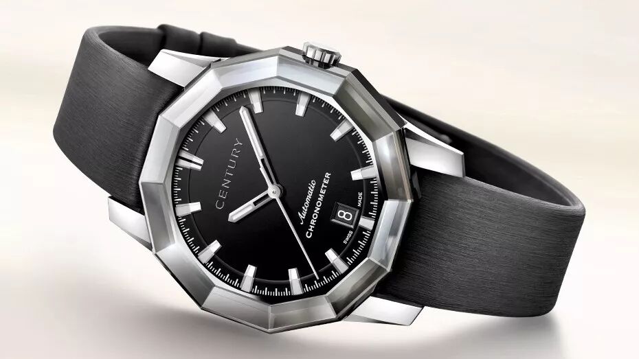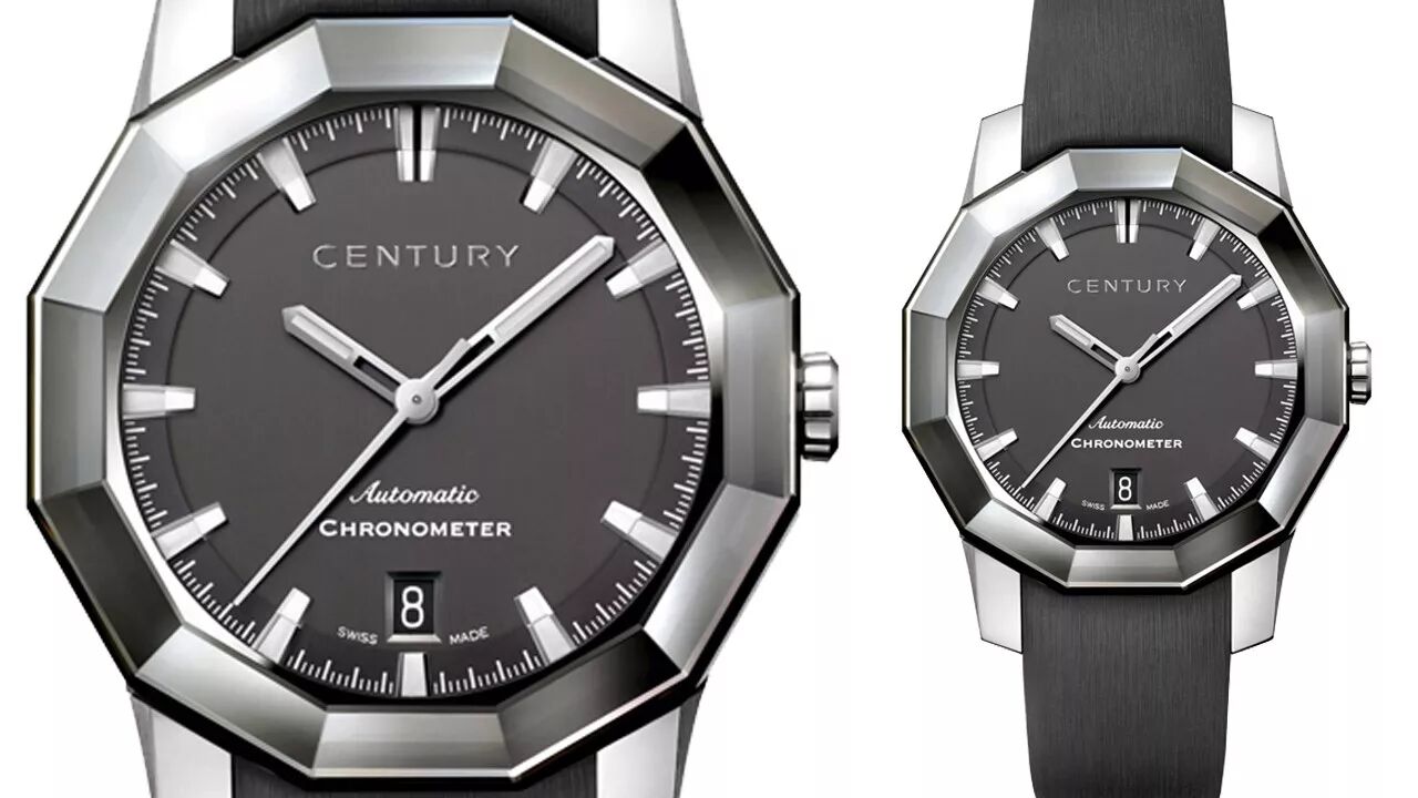 这款世纪表表壳同样采用世纪蓝宝石,做了12切面处理,表盘尺寸38.5mm,作为男性腕表显出一股高贵清秀之气,但其表盘及表带的深灰选色增添了阳刚之气,机芯搭载ETA 2892A2,稳定精准有保障,6点钟位置设置日期窗口。
