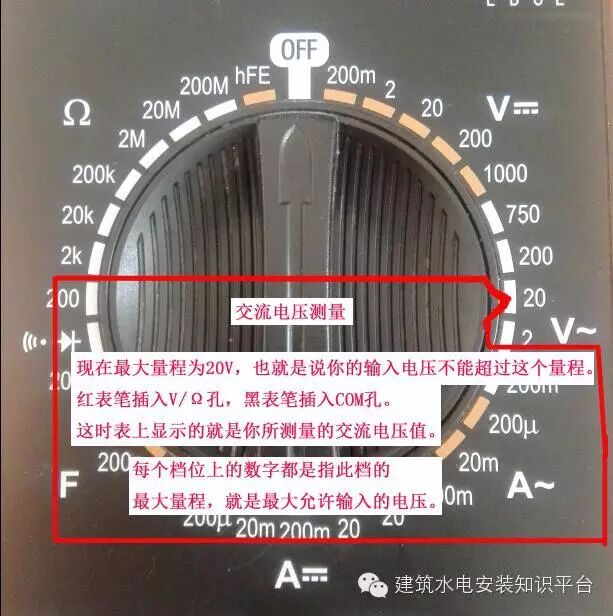 2、交流电压的测量。表笔插孔与直流电压的测量一样,不过应该将旋钮打到交流档“V~”处所需的量程即可。交流电压无正负之分,测量方法跟前面相同。 无论测交流还是直流电压,都要注意人身安全,不要随便用手触摸表笔的金属部分。