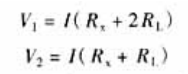 在上图所展示的这一馈线电阻补偿测量法的操作示意图中,当恒流源电流I通过馈线2流入被测电阻,此时馈线1接地,馈线2和3分别接运放A1和A2的输入端。若两运放的增益都为1,其输出电压V1和V2可计算为: