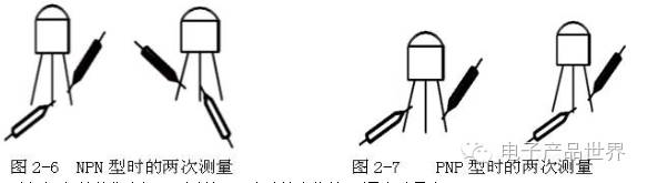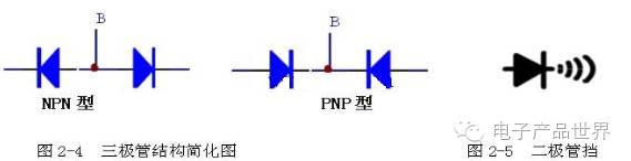 根据三极管的内部结构,可以将三极管的内部看作两个二极管组合而成,如图2-4所示。对于PNP管的基极是两个二极管负极的共同点,NPN管的基极是两个二极管正极的共同点。利用这一点可以用数字万用表的二极管挡。