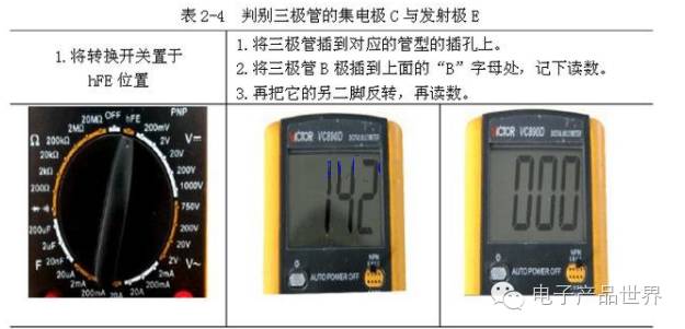 2.判别三极管的集电极C、发射极E及直流放大倍数(测量方法见表2-4)
