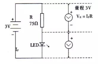 外接电源测量。用3V稳压源或两节串联的干电池及万用表(指针式或数字式皆可)可以较准确测量发光二极管的光、电特性。为此可按下图所示连接电路即可。如果测得VF在1.4~3V之间,且发光亮度正常,可以说明发光正常。如果测得VF=0或VF≈3V,且不发光,说明发光管已坏。用如图所示方法检测,可以测出该LED的伏安特性。