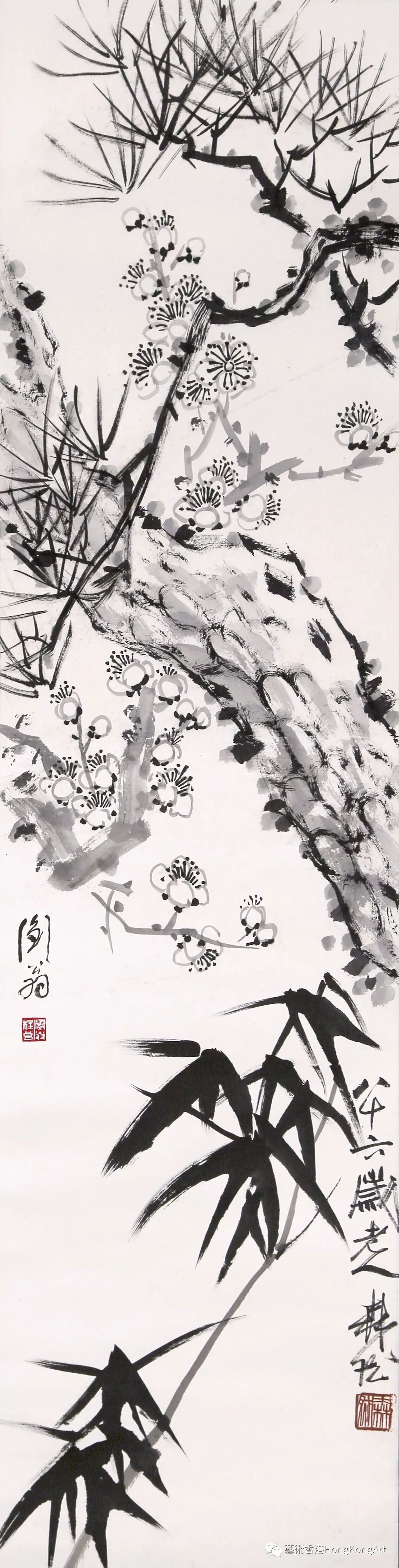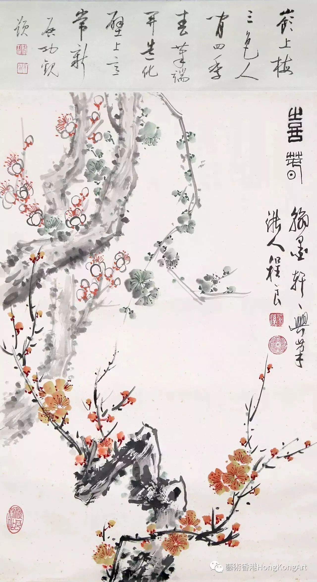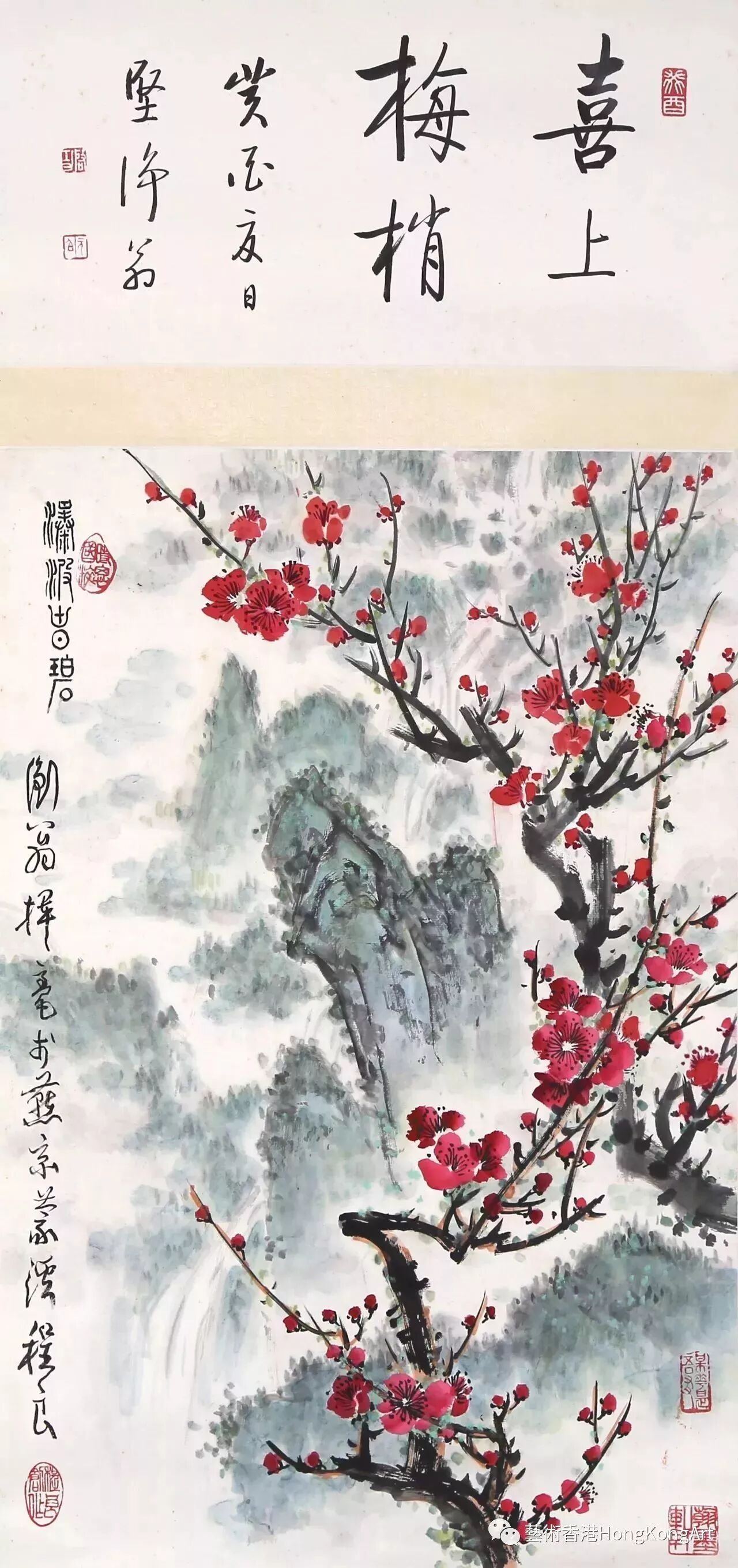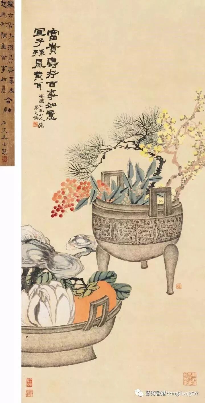 此幅《百事如意》是赵之谦笔下典型的“岁朝清供”博古图,描绘了天竺子、腊梅、松枝、玉兰、柿子与灵芝等六种花卉蔬果。画面布局独平稳,落笔不滞疑,花卉从古鼎中生发,生气盎然。两株松枝、黄梅向上斜出,蜿蜒俊俏,天竺子则伸向鼎外左边,参差错落,蕴含生动情趣,更增添了画面节奏和韵律。花卉果木大小疏密,花枝长短错落。设色雅丽,独具风格,不仅顾及了古鼎的器型,也顾及了鼎身的纹饰,相互相应,和谐统一。在花卉的描绘上颇重视细节,如细密有如针刺的松针,腊梅的点点黄花瓣,得其大意,可谓有粗有细、有收有放。赵之谦将其书法篆刻成就移入绘画,画风挺拔,峻峭,浓艳,厚重,能大胆吸收民间绘画色彩优点,一变传统画法的柔媚风气,雅俗共赏,突破了古代文人画家所秉承的“夫画道之中,水墨为上”的原则,对后来上海画派的发展产生了深远影响。