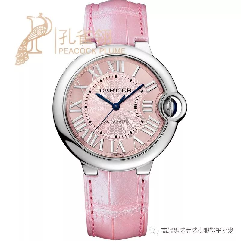 Ballon Bleu de Cartier卡地亚蓝气球腕表,36毫米表款,自动上链机械机芯。精钢表壳,凹槽式表冠,镶嵌一颗凸圆形合成尖晶石,粉色表盘,罗马数字时标,剑形蓝钢指针,蓝宝石水晶镜面,粉色鳄鱼皮表带,精钢折叠表扣。表壳尺寸:直径:36毫米,表壳厚度:12.05毫米。防水深度3巴(约30米)