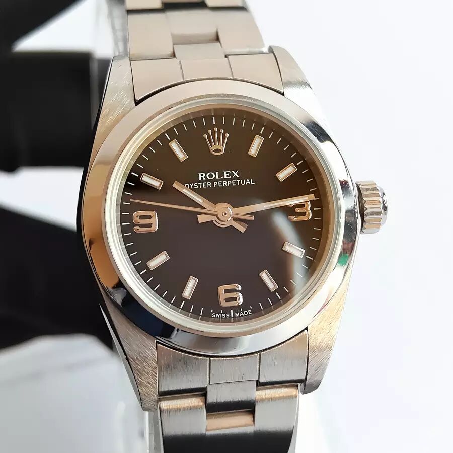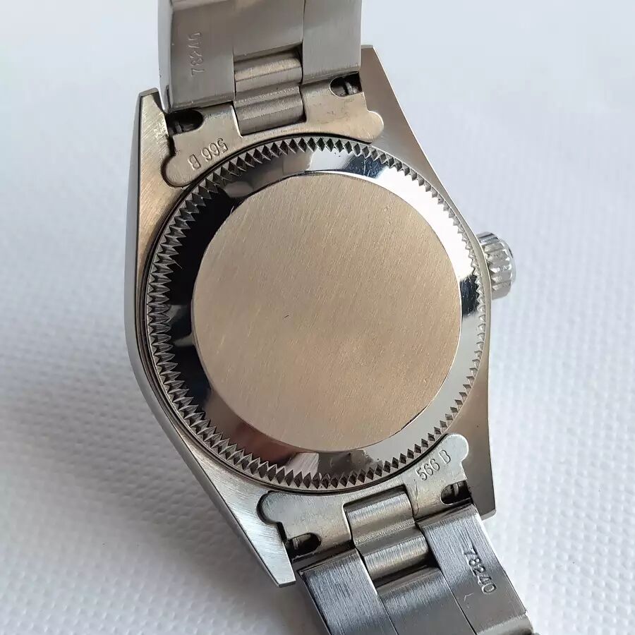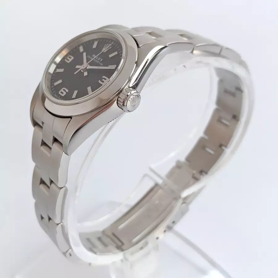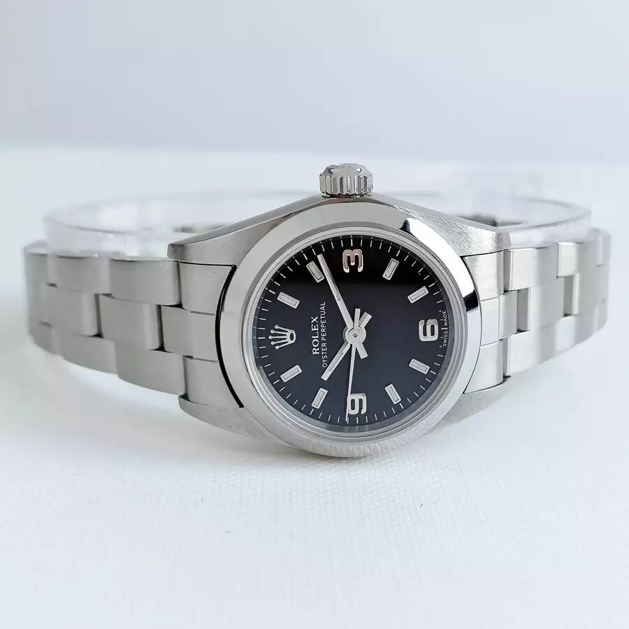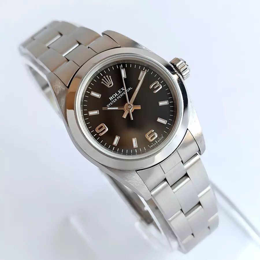ROLEX劳力士蚝式恒动钢款黑盘机械女士腕表(A字头)。型号:76080,整表精钢打造,25MM表径,黑色表盘,夜光条+阿拉伯数字刻度,棒形指针,简洁干练,劳力士经典造型~!蓝宝石水晶镜面,锁把锁扣,绝对的牢固。搭载自动机械机芯,女表中难得的自动机械款!蚝士表壳——游泳、洗澡都可以戴~!精钢表链,折叠扣(可微调)!
