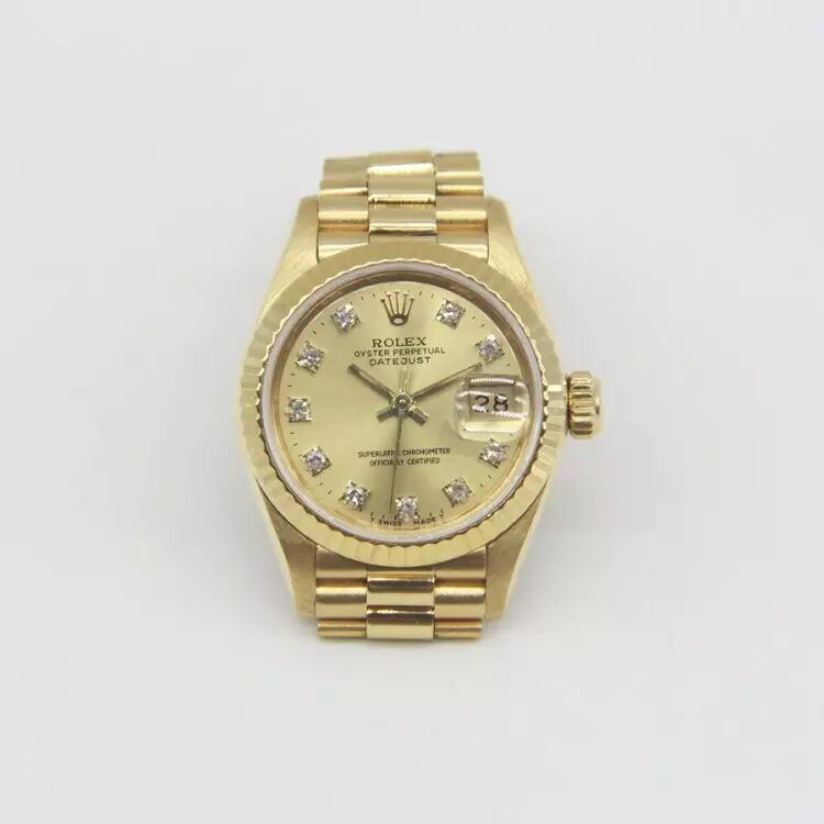 Rolex劳力士全黄金钻刻女士腕表。型号:69178G,整表所有地方都为18K实金,高贵华丽。26MM表径,10个华美原镶钻石刻度,简单大方,经典表款!蓝宝石水晶玻璃表镜,鱼眼泡放大日历,状态超棒,超天文台认证的2135恒动精准机芯,蚝士表壳+表链——足以应对日常防水需要!女人必备极品,分量十足~!