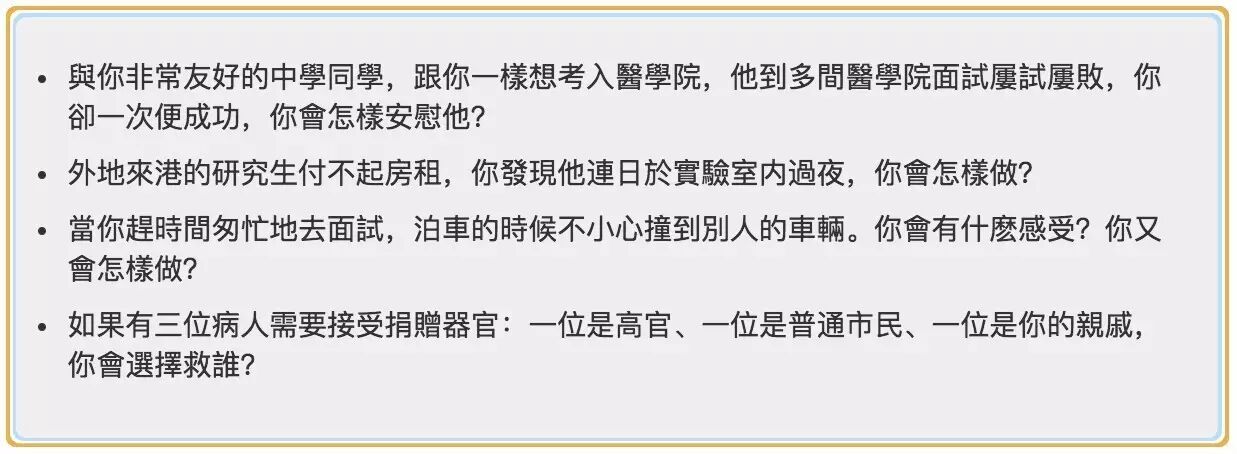 另一方面,院校面试采取新花招,录取门槛更高更严,优中选优。今年港大医学院更改了面试模式,由原来的10人小组面试讨论,改变为独自“过4关”,包括时事题以及伦理题,全面考察学生。