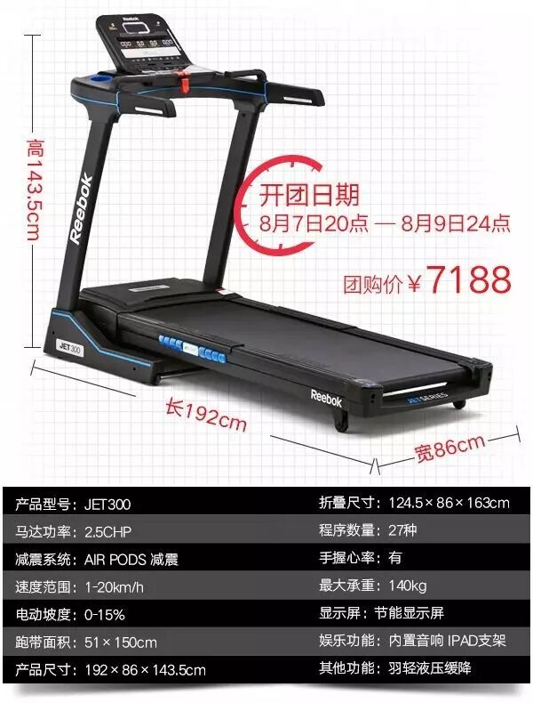 可用于购买JET300跑步机,到货后返现200,实现团购价7188。