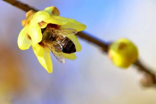 初入园中便会觉得暗香扑鼻,而当周遭草木凋零时,那长在苍遒的枝杈上的几朵腊梅却迎来了美丽的初绽,黄色的花瓣里还有一层淡紫色晕纹。![]()