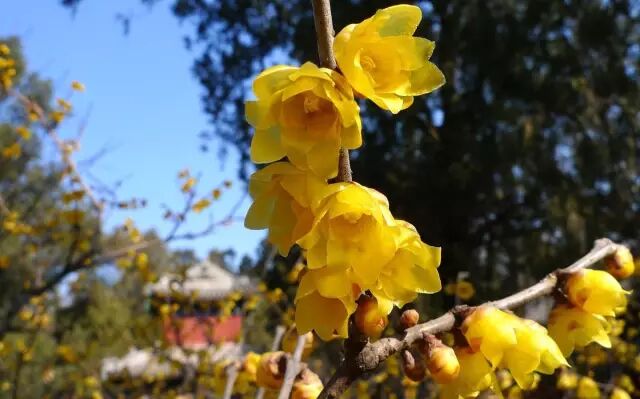 月坛公园南园的西南角(邀月亭附近的爽心亭、咏月碑廊和静月轩旁)种植着数株腊梅,目前正处于花期,可以前往观赏。