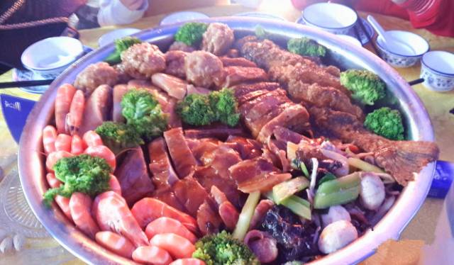 在香雪公园里面,气氛很热闹。这里有非常大的养鱼池海鲜池,还有蛇,鹅等,自养的鸡随处走,主打的就是新鲜食材,以桑拿菜闻名。大盆菜分量十足,有烧鹅、烧鸡、扣肉、鲜虾、罗非鱼、肉丸、腐竹、蔬菜等,排列整齐,做得精致,看着就食欲大振!