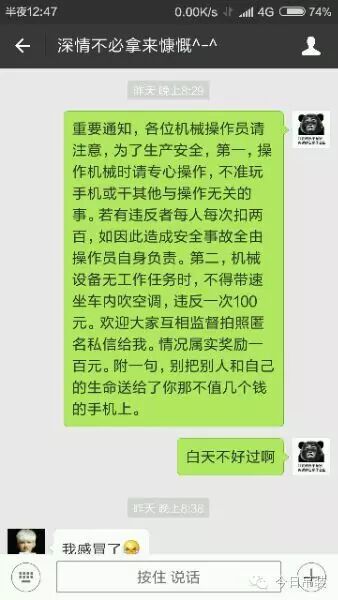 他说:一到公司就签合同,这也司机赔偿,那也是司机的事。老板只负责车况发生的意外!现在又搞个不平等条约!玩手机本来就不对!这点我赞同,但是这语气也没谁了!实在混不下去了。那天出点问题还的老婆拿钱来取人
