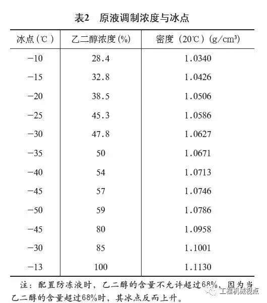 根据环境温度条件选用防冻液的冰点,一般情况下,防冻液应选比当地环境低10~15℃,如当地环境气温为-20℃,则防冻液的冰点应选择在-30℃以下。如果选用防冻液母液进行配制时,可根据表2 进行配制。