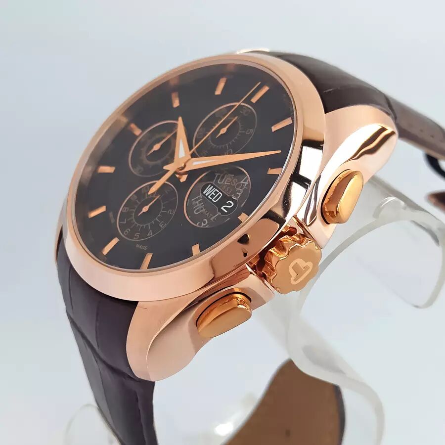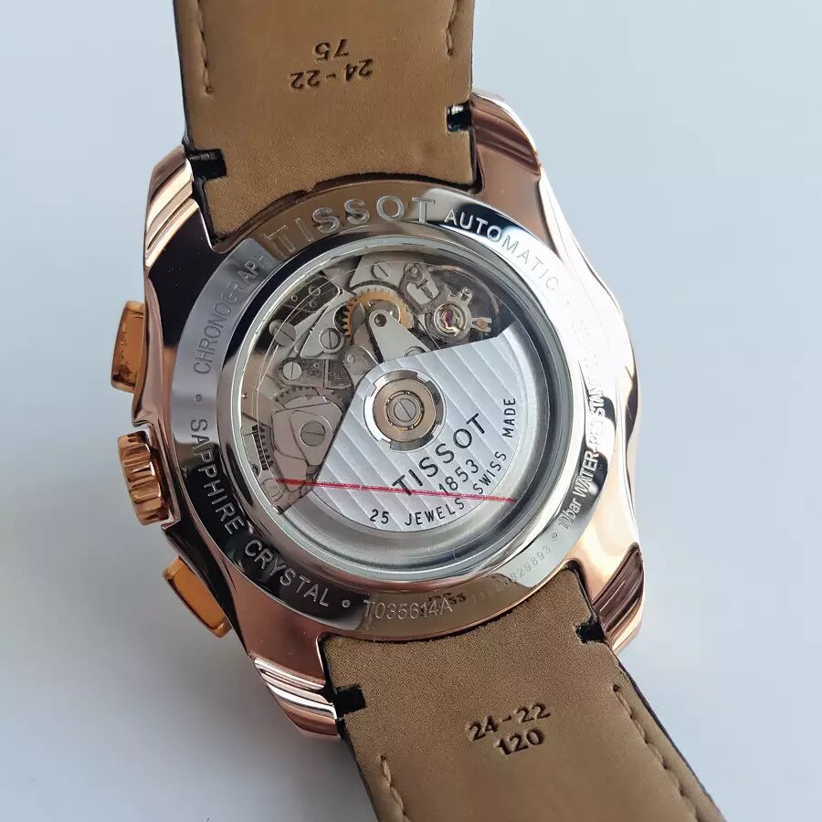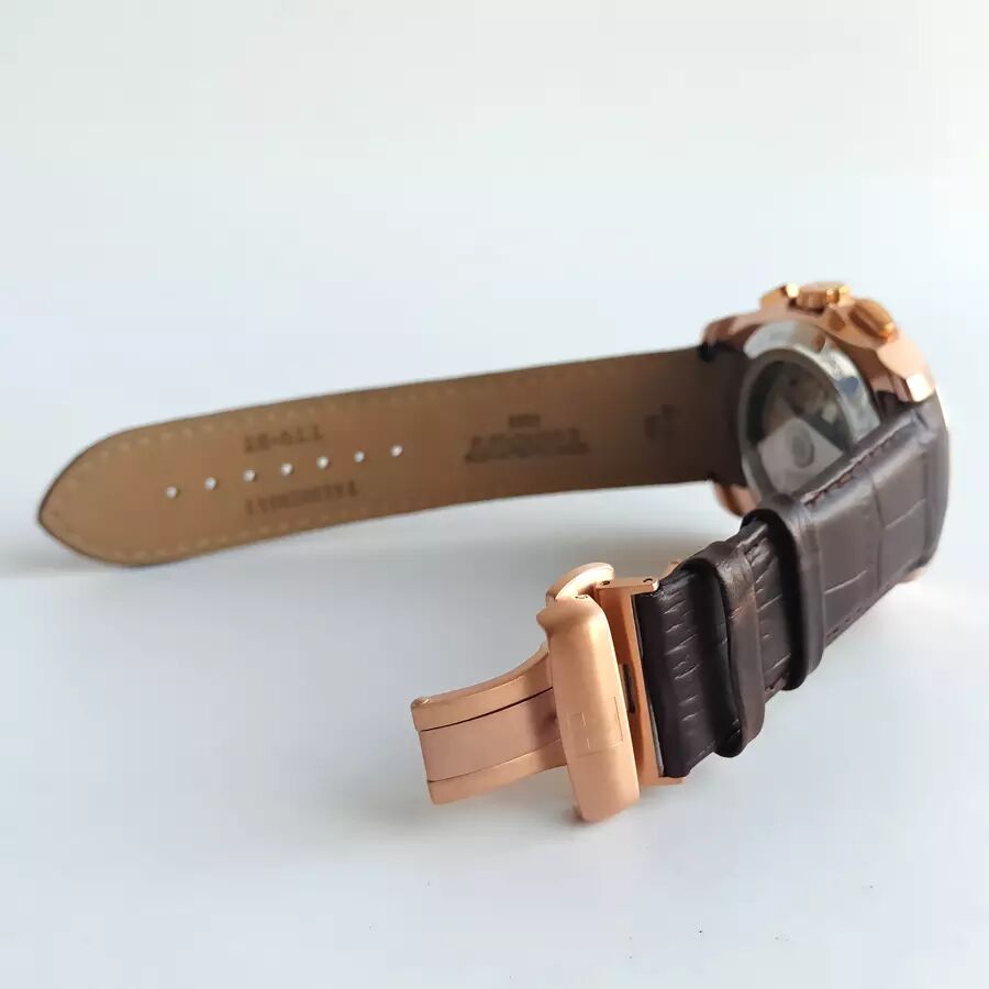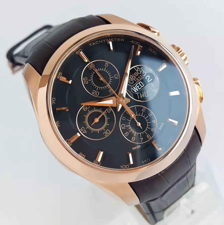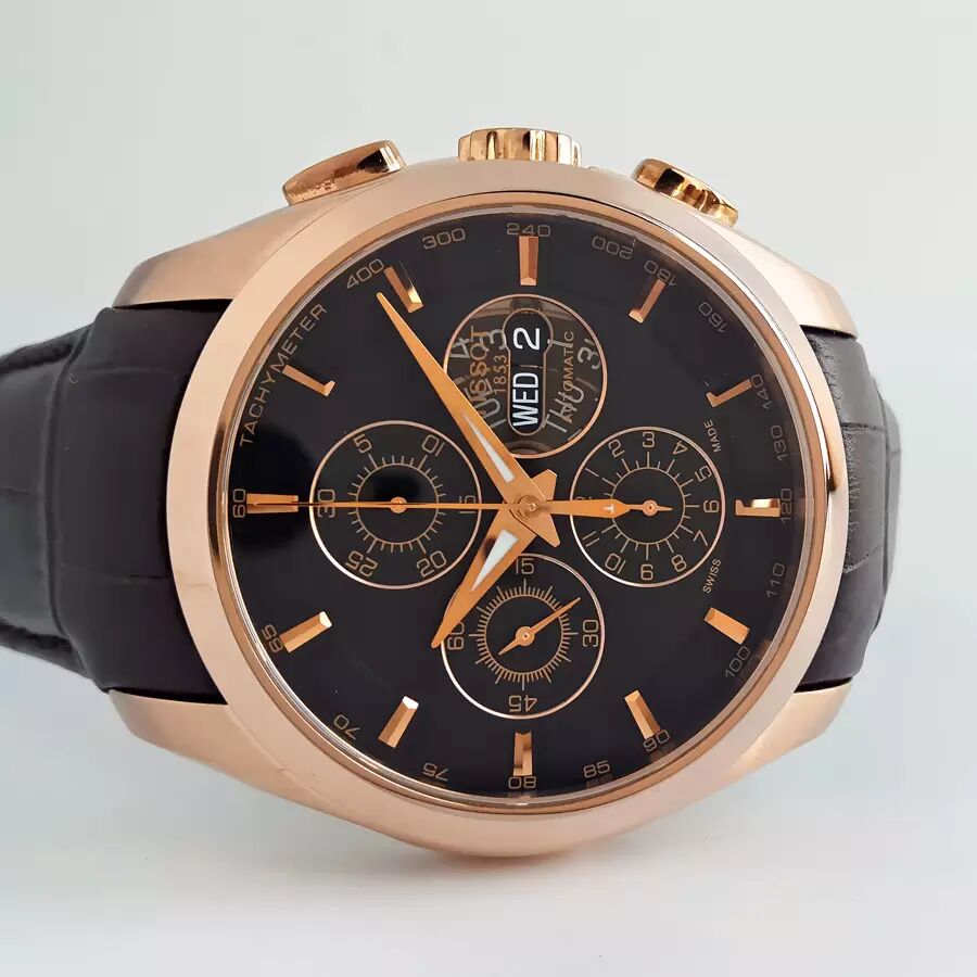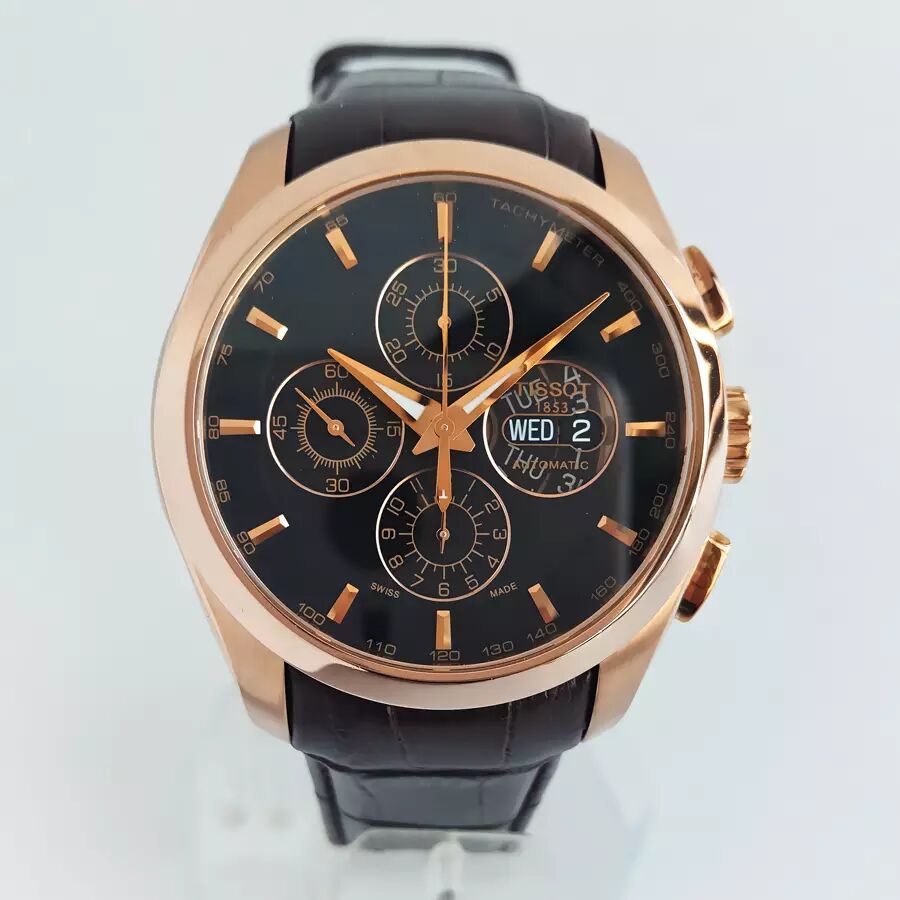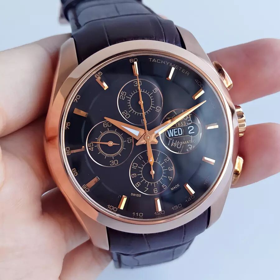 天梭COUTURIER库图系列镀玫瑰金黑盘双历计时男士腕表。型号:T035.614.36.051.00。整表金色处高贵镀金,43MM大表径,经典百搭的黑色表盘,立体钉条刻度,简约时尚。蓝宝石水晶镜面及底镜,精打磨背透高端7750计时机械机芯(浪琴、欧米茄、万国计时表都有用此款机芯)。3点位置日历+星期窗口显示,12点位置分钟计时盘,6点钟位置小时计时盘,9点位置小秒盘显示!原装棕色表带,方便的蝴蝶按扣,夜光凌厉~!