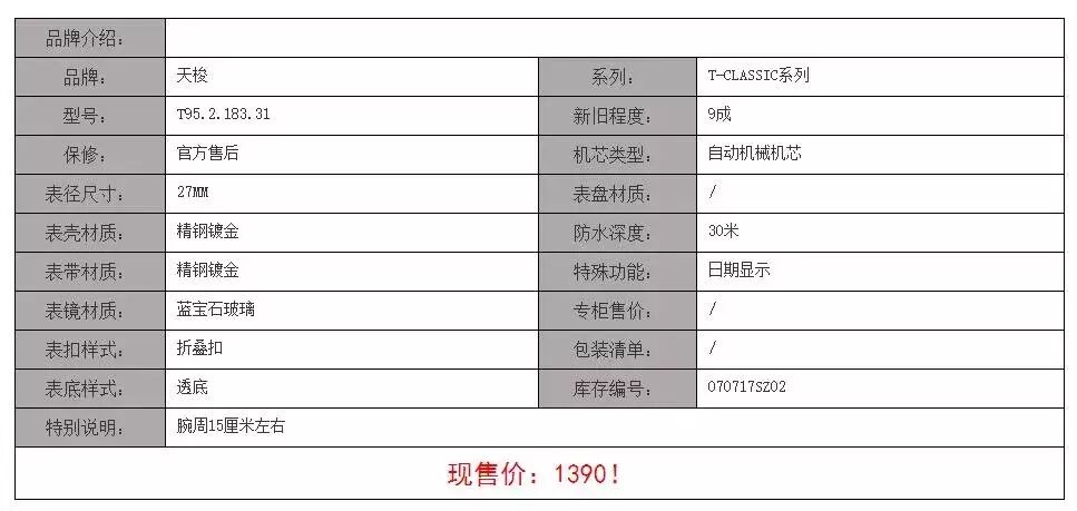 天梭T-CLASSIC系列精钢镀金自动机械机芯表T95.2.183.31 现售价:1390!070717SZ02