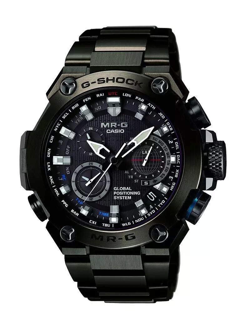 1996年,曾经只能用树脂实现的防震构造,首次在全金属材质得以实现,全金属材质防震手表G-SHOCK MR-G系列诞生。它将GPS+电波接收双重时间校正系统搭载在全金属防震表身之中。GPS+电波接收双重时间校正系统,将GPS卫星信号接收和标准电波(6局电波接收)两种不同的时间校正模式集合在表身之内,迅速解析时区和夏令时信息,在全球范围内精准校对手表时间。而强劲太阳能驱动系统,不仅仅是太阳光,连微弱的日光灯源也能转化为电能,并储存于大容量蓄电池里,保证各种功能的稳定运行。其电子表冠、按钮和保护零部件采用全新一体化构造,实现强大防震性能却保持小型尺寸;表壳和表带经过碳化钛深度硬化处理。