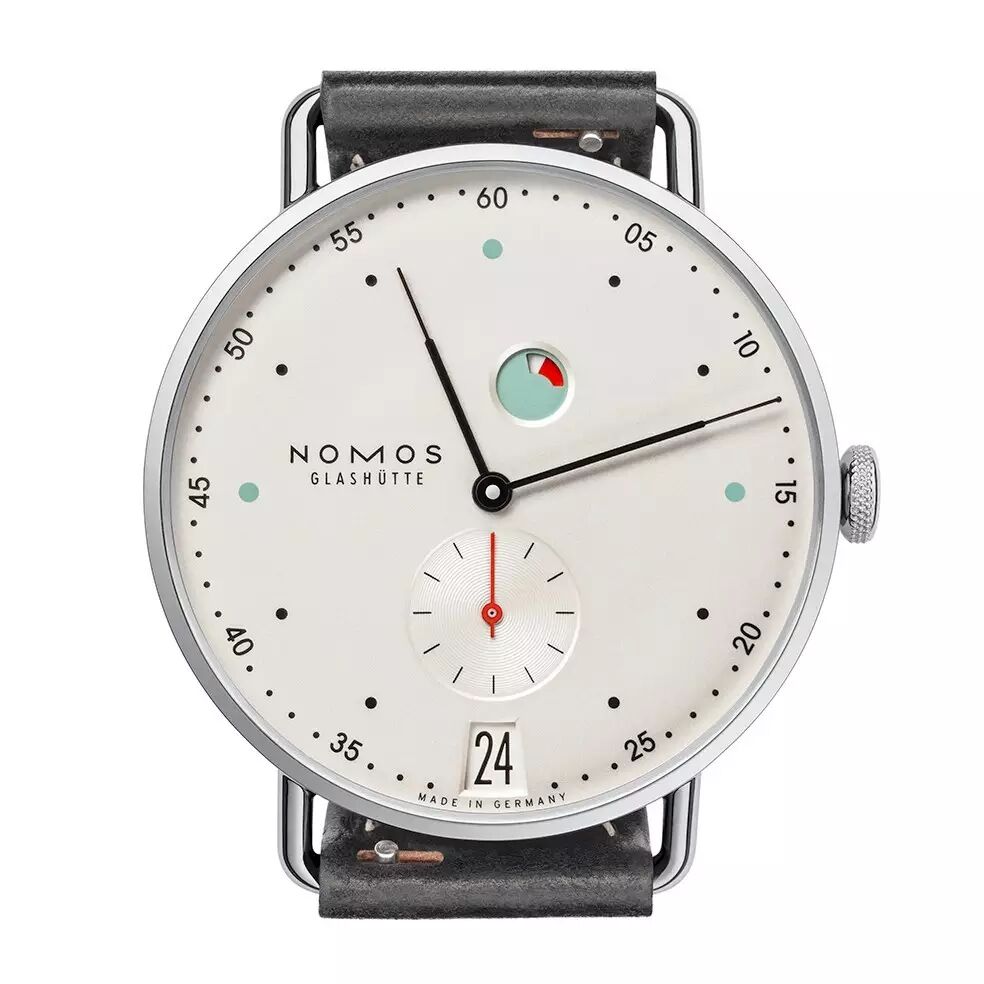 这枚腕表搭载DUW4401手动上链机芯,首次采用品牌自行研发的全新擒纵机构。腕表由知名柏林设计师 Mark Braun打造,动力储存显示以薄荷绿搭配红白两色进行显示,除了显示时分外,指针的特别设计带来全新的指示方式:指针末端变尖,令指示更为精准。同样新颖别致的细节还有:模拟精密测量仪器的分钟时标。