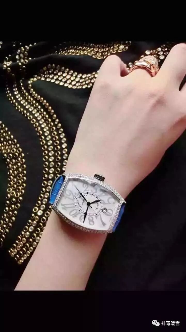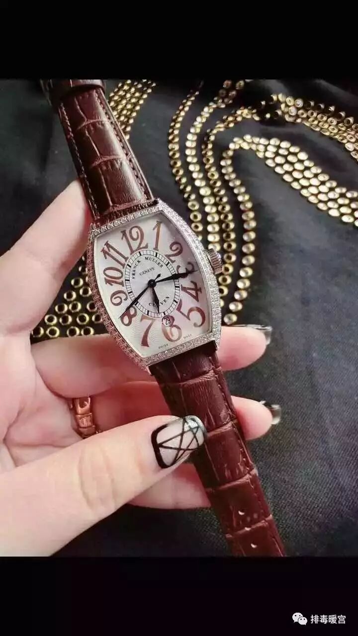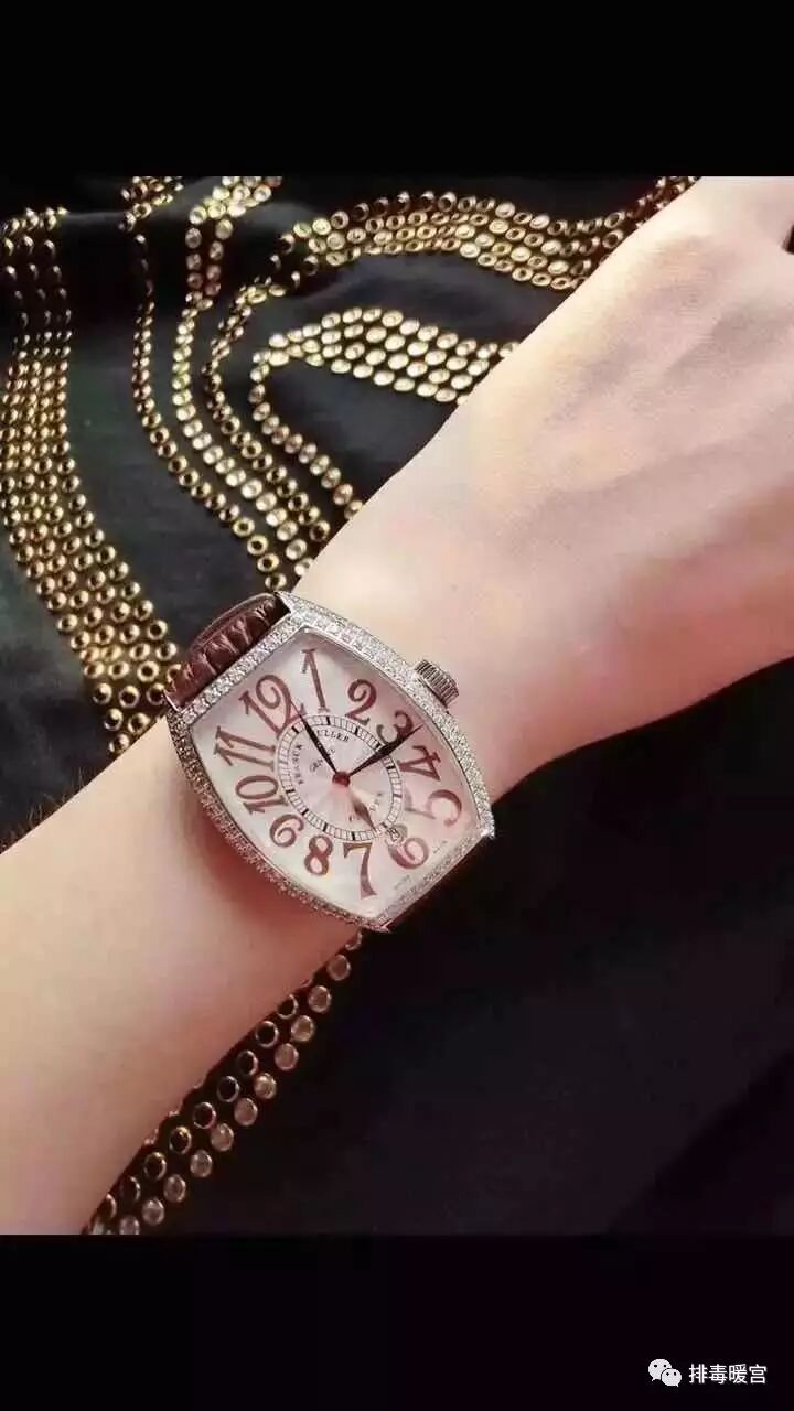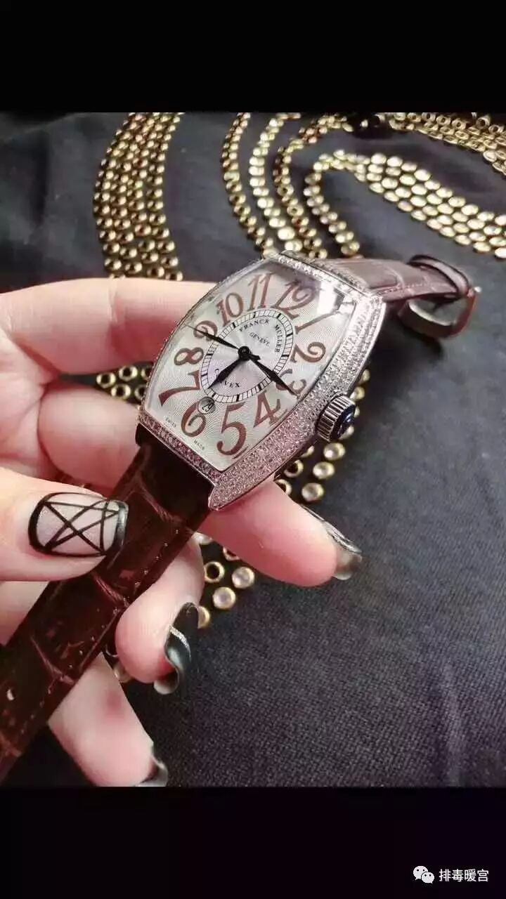 Fm法兰克穆勒女款镶钻机械腕表。这款腕表从视觉上,尽管也是酒桶型,但和市面上的酒桶型腕表有着显著的区别,首先它的表耳短小精悍,其次表壳较为厚实,最后表壳边缘更为圆润。如果从侧面去看,它的表壳会呈现更加优美的弧线,这也正是法穆兰腕表表壳研制深厚功底的体现。F5765786
