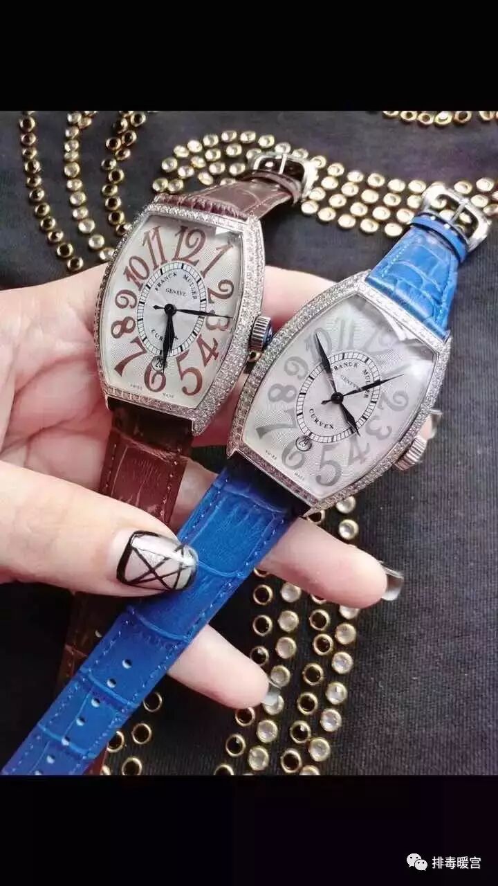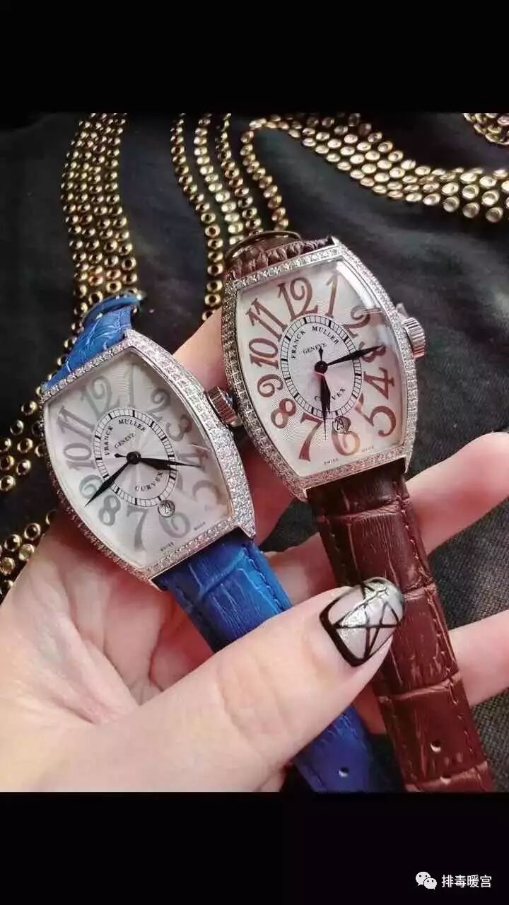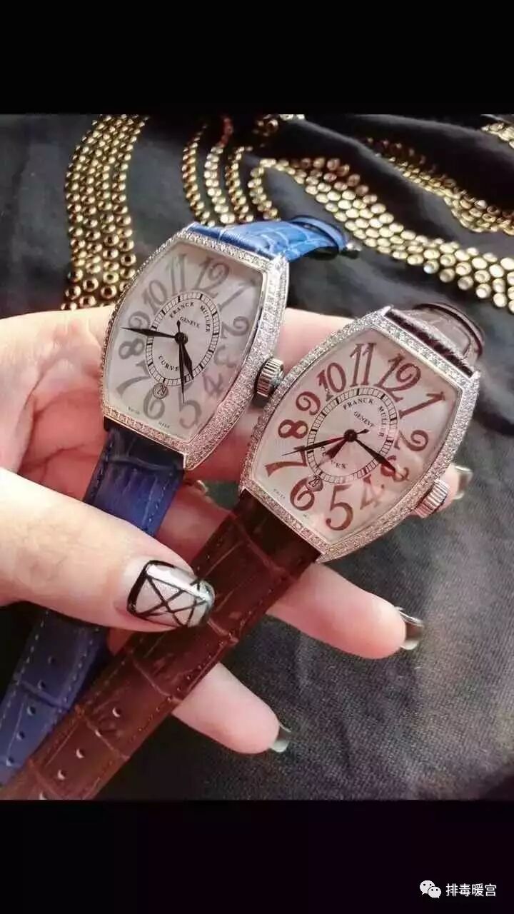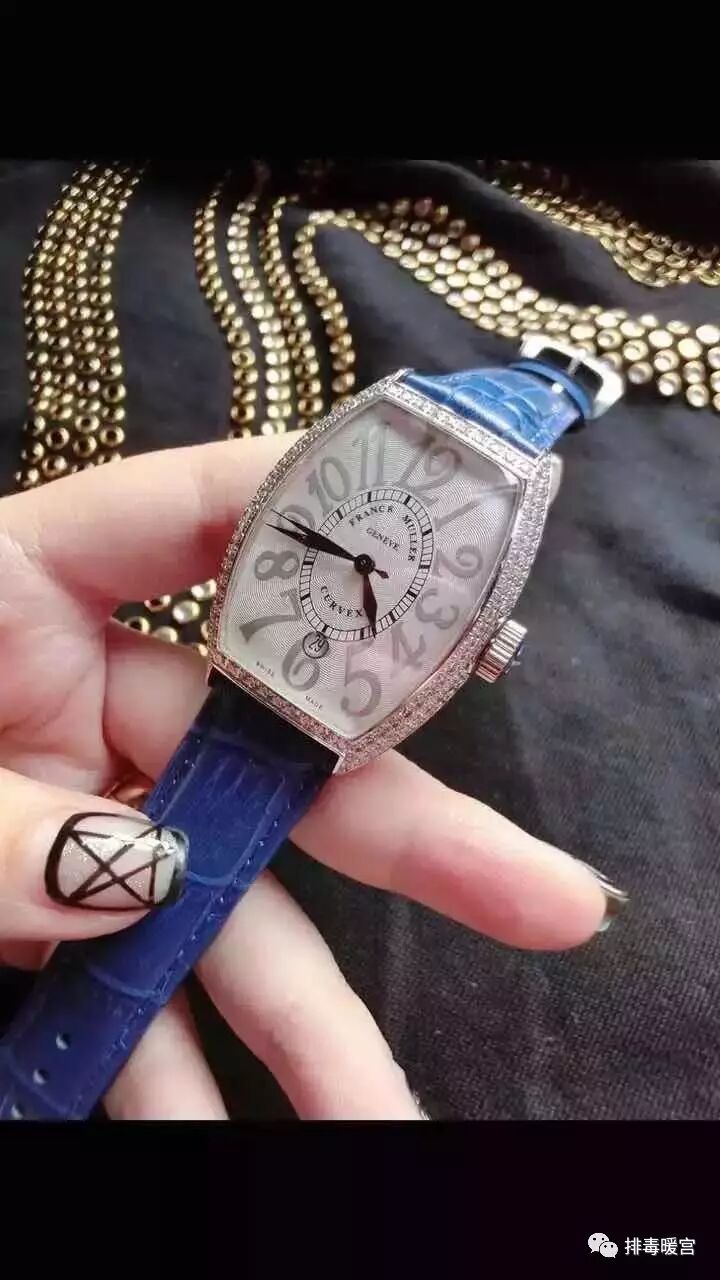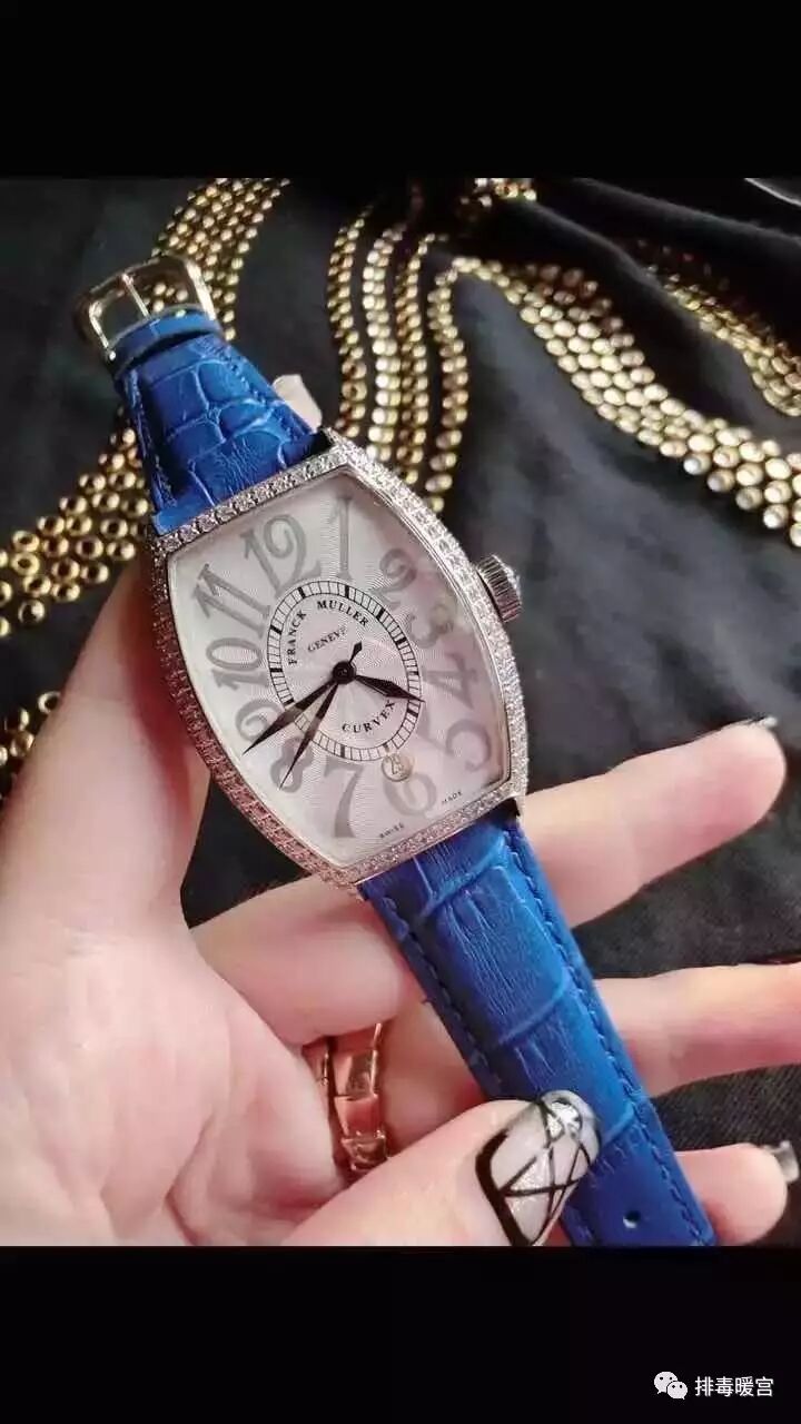 Fm法兰克穆勒女款镶钻机械腕表。这款腕表从视觉上,尽管也是酒桶型,但和市面上的酒桶型腕表有着显著的区别,首先它的表耳短小精悍,其次表壳较为厚实,最后表壳边缘更为圆润。如果从侧面去看,它的表壳会呈现更加优美的弧线,这也正是法穆兰腕表表壳研制深厚功底的体现。F5765786