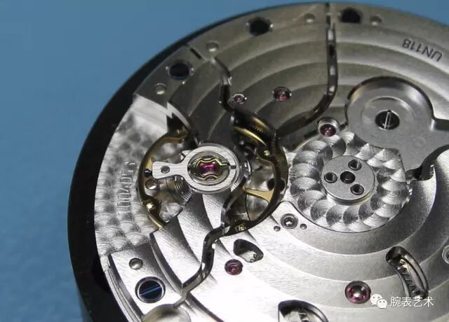 通常一款刚出厂的腕表,摆轮的振幅大约为280至310度左右(平放满鍊时),所谓的振幅大小就是摆下方的月形红宝石,受到擒纵叉的拨动,所产生的转动角度,各位读者可以想像你用手推动弹力门的状况,力量越大,回弹的力量也大。但随著时间的过去,摆轮的振幅(或说摆幅)会慢慢变小,因为摆轮上下两侧的宝石轴承中,润滑油会渐渐变乾、变少,同时其他走时轮系的轴承,也会发生相同的状况(润滑油变乾、挥发..等)。所以原本发条盒所传递过来的动力,其效率会越来越差。