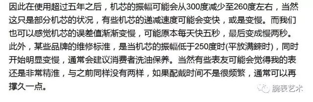 根据我个人的使用经验来说,许多表款在使用五年之后,摆轮的振幅仍然是超过250度以上。因此关于这种情况,之前我曾经询问另一位维修师傅,他认为部分机芯其实在使用五年之后,如果运作良好,也未必需要洗油保养;不过超过8、9年之后,会建议一定要洗油,因为时间太长,乾掉的润滑油与金属粉末,会使轮轴磨出程度不一的损伤,此时还是建议送去保养。