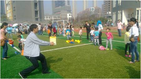 活动规则:参赛家庭1人拿着桶子站在三米外,还在依次将30个小球投向桶内,家长在固定的圈内可以移动接球(不能直接用手接球),规定时间为两分钟!