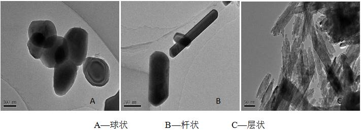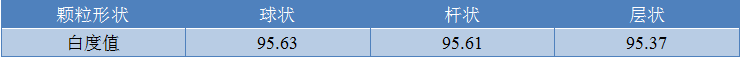 颗粒形状是指钛白粉颗粒的存在状态,可分为球状、杆状和层状,如图4所示。球状为颗粒呈球行或类球形,杆状为颗粒的横截面和纵截面为长方形和圆形或类似形状,层状颗粒为颗粒厚度较薄但一侧面积较大。这三种颗粒形状在钛白粉中常见,球状为理想状态,但是由于包膜或气粉的因素可能产生杆状和层状。人为控制气粉条件,生产出三种形状的钛白粉,用MS-350白度测试仪测量白度,得到的结果见表3。