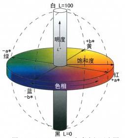 为了进一步改进和同一颜色的评价方法,国际照明委员会(CIE)引用了L、a*、b*三个数值来表示某一颜色,L值为亮度,变化范围了0~100,L=0为完全黑暗,即为黑色,L=100为明亮。a*、b*值有正负之分,其中a表示红绿色,-a*为绿色,绝对值越大,绿色饱和度越大,+a*为红色,数值越大,红色越强烈。b*值为黄蓝色,-b*为蓝色,绝对值越大,蓝色越深,+b*为黄色,数值越大,黄色越深。有了这三个数值之后可在空间建立三维颜色坐标系,见图1,L、a、b为坐标轴,任何一种可见光颜色都可以在坐标系中表示出来,这种表示方法比于Y和Pe更为精确,适用范围更广。