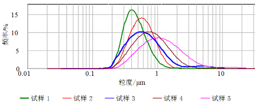 粒径和粒度分布也是影响钛白粉白度的主要因素,它主要是通过钛白粉颗粒对光的反射、散射等现象影响的。图2为5个钛白粉样品的粒度分布图,图中横坐标为颗粒的粒度,纵坐标为该粒度的钛白粉在体系中的占有比例,即频率,曲线下方的积分为1。图中曲线峰值越大,峰域越窄,曲线越偏左,代表该种颗粒的钛白粉粒径越小,粒度分布越集中,钛白粉的各项性能就越好。